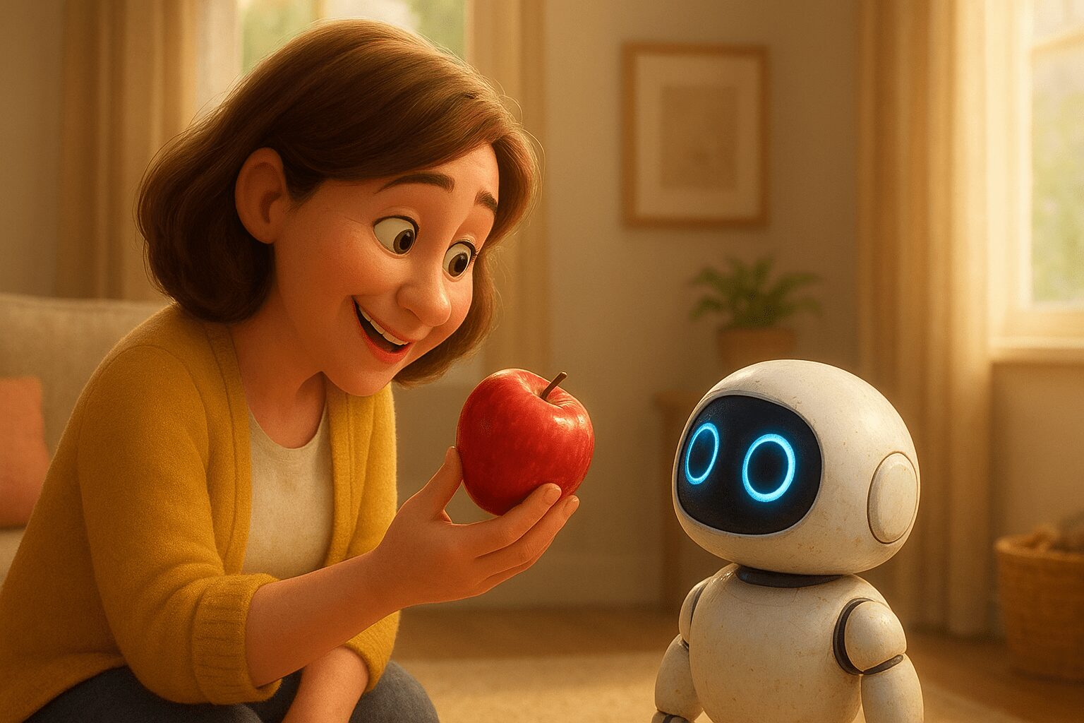 - 人間:「違うよ、もっと元気に『こんにちは!』だよ」