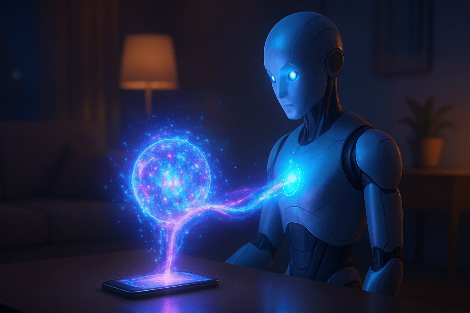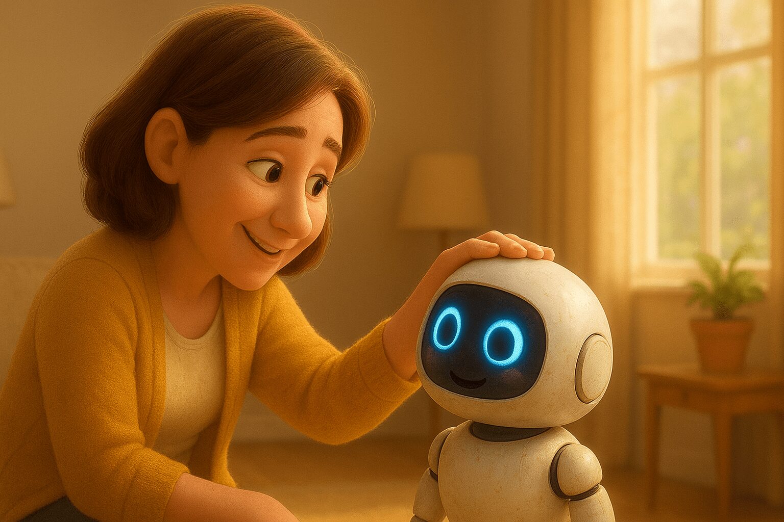 家では「人型ロボット」に入っていて、身振り手振りを交えておしゃべり。外出時はスマホやスマートグラスの中に「魂(データ)」だけが移動してついてくる。